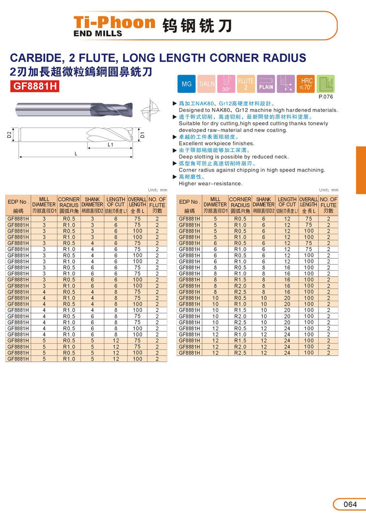 8. 2刃加長超微粒圓鼻鎢鋼立銑刀064