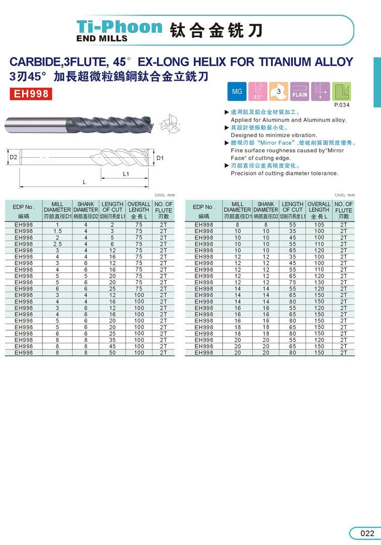 2. 3刃加長鈦合金立銑刀022