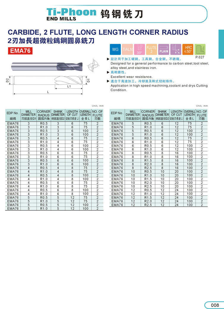 8. 2刃加長超微粒圓鼻鎢鋼立銑刀008