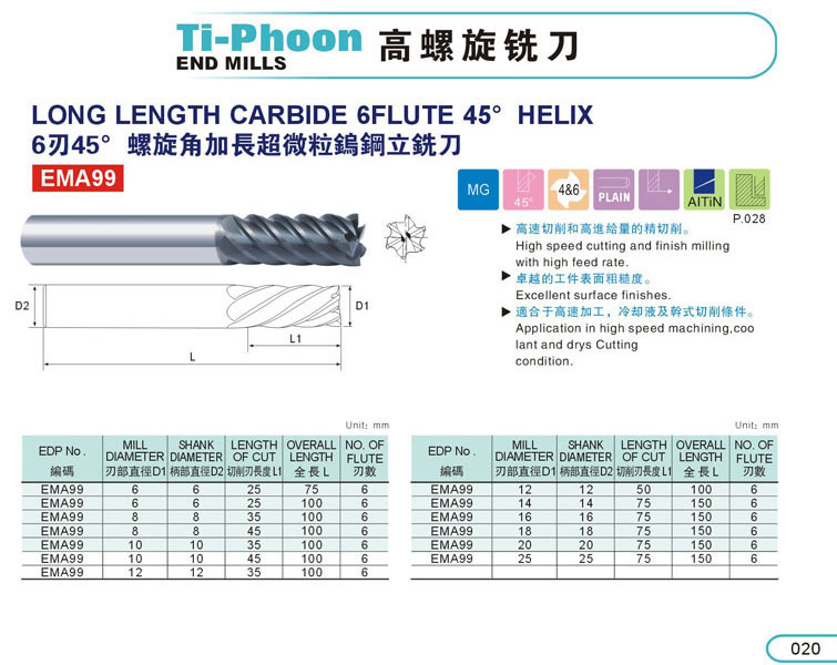 14. 6刃加長超微粒鎢鋼立銑刀020-2